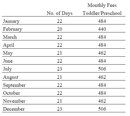 Our child care fees are capped at $22.00 a day per child enrolled at River Parkway Children’s Centre. Please review our monthly fee schedule below.